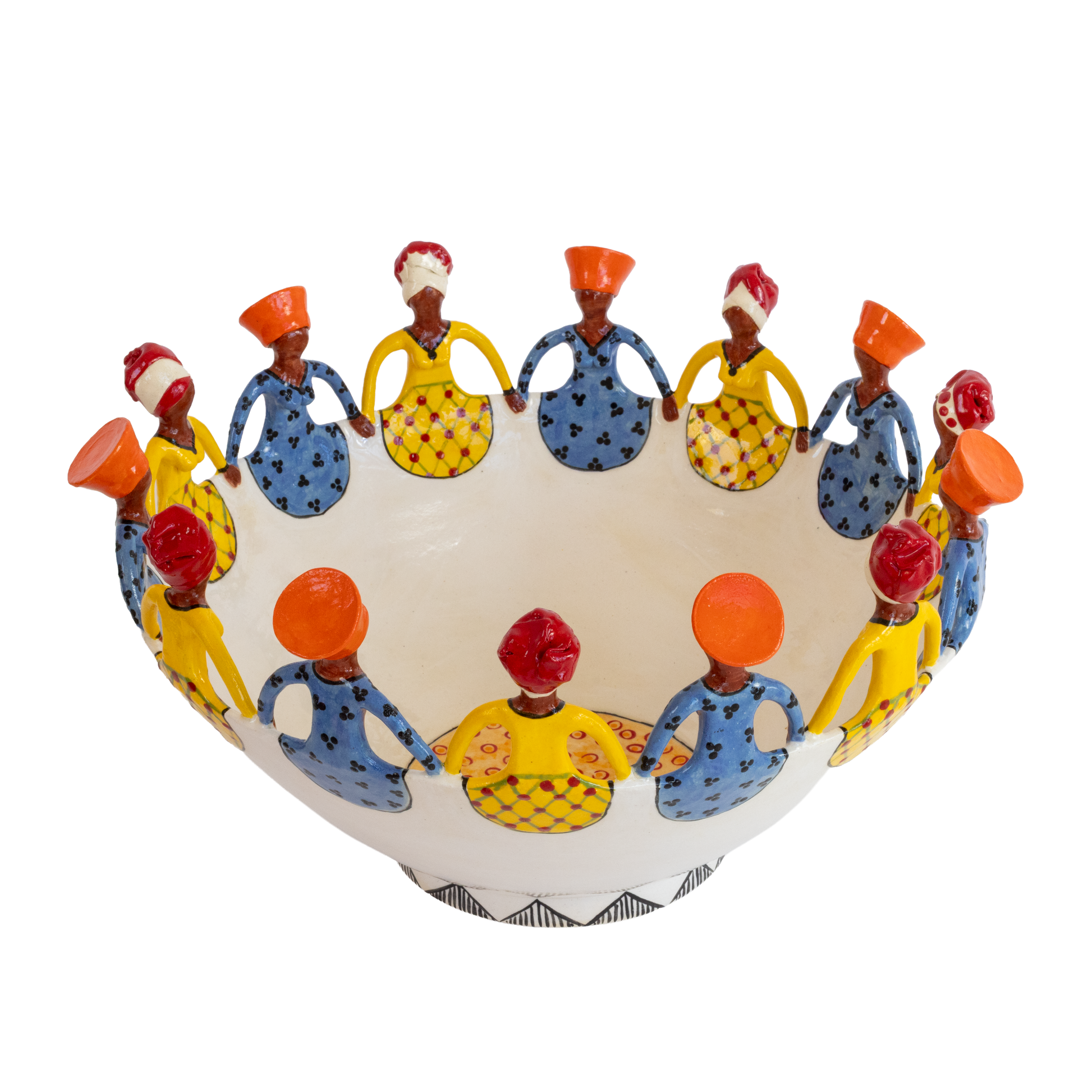 This Women of Africa bowl depicts women from two of South Africa's indigenous tribes, the Zulu and the Xhosa, holding hands in unity. Joining them are Indian women figures in their traditional clothes. They are the strong Women of Africa and they support and carry one another through life.