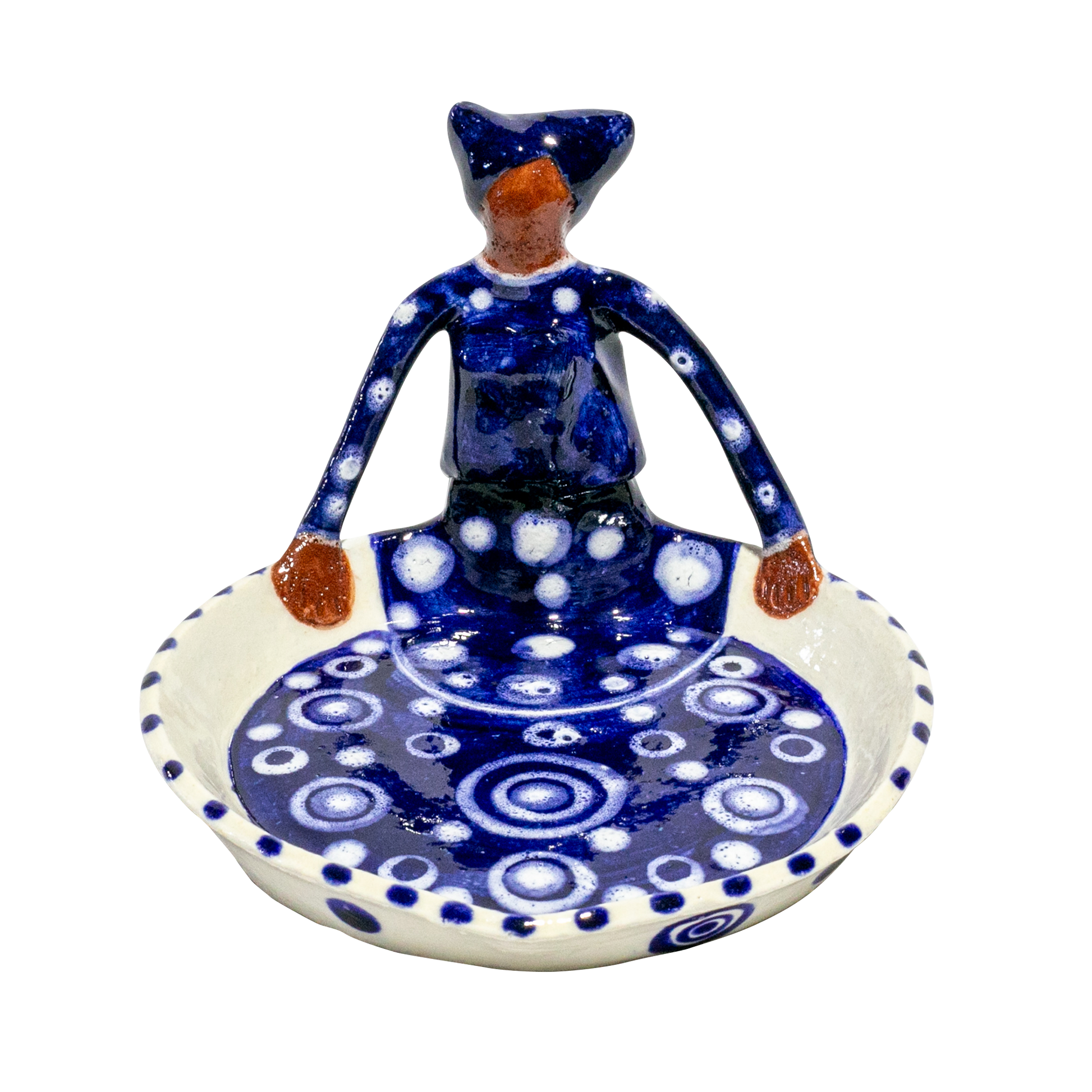 This bowl is painted with indigo glaze. The indigo designs are reminiscent of the blue Shweshwe patterns so beloved by all South Africans.