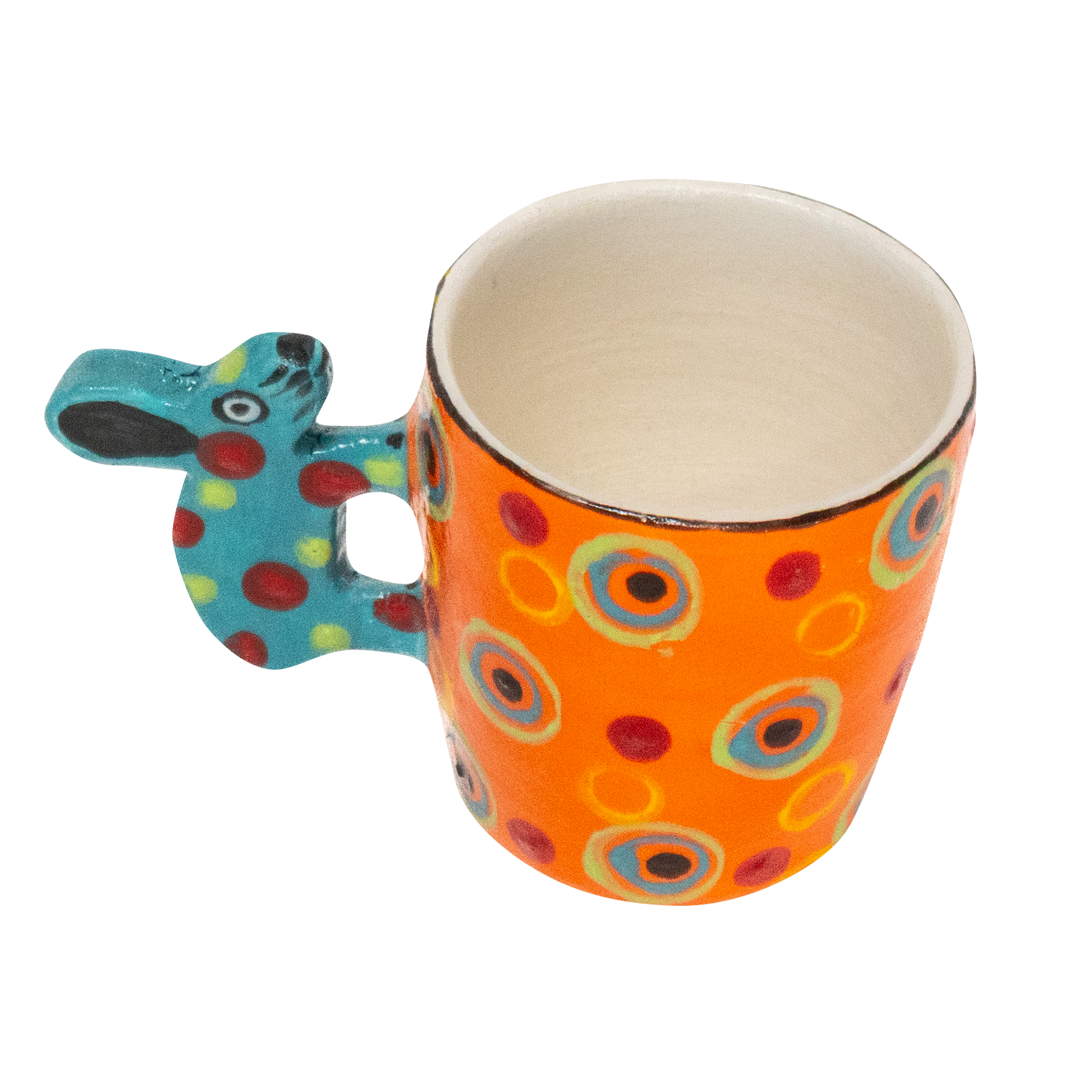 Each of these colourful mugs is wheel-thrown from stoneware clay with skill and care. The bright glazes are painted in beautiful African patterns, and the mug's handle is a hand-formed rabbit.